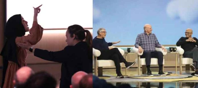 மைக்ரோசாப்ட் AI இன் தலைமை நிர்வாக அதிகாரி முஸ்தபா சுலேமான் பேசிக்கொண்டிருக்கும் போது அபூசாத் என்ற ஊழியர் “முஸ்தபா, உங்களுக்கு வெட்கமாக இல்லையா” என்று கூச்சலிட்டார்.