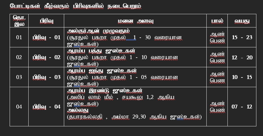 இப்போட்டிகள் முஸ்லிம் சமய பண்பாட்டலுவல்கள் திணைக்களத்தில் பதிவு செய்யப்பட்டுள்ள அரபுக் கல்லூரிகள், ஹிப்ழுல் குர்ஆன் மத்ரஸாக்கள் மற்றும் அரச பாடசாலைகள் அல்லது அரச அங்கீகாரம் பெற்ற தனியார் பாடசாலைகளில் கல்வி கற்கும் மாணவர்களை மையப்படுத்தி ஆண், பெண் இரு பாலாருக்கும் நான்கு பிரிவுகளாக நடாத்தப்படும்.