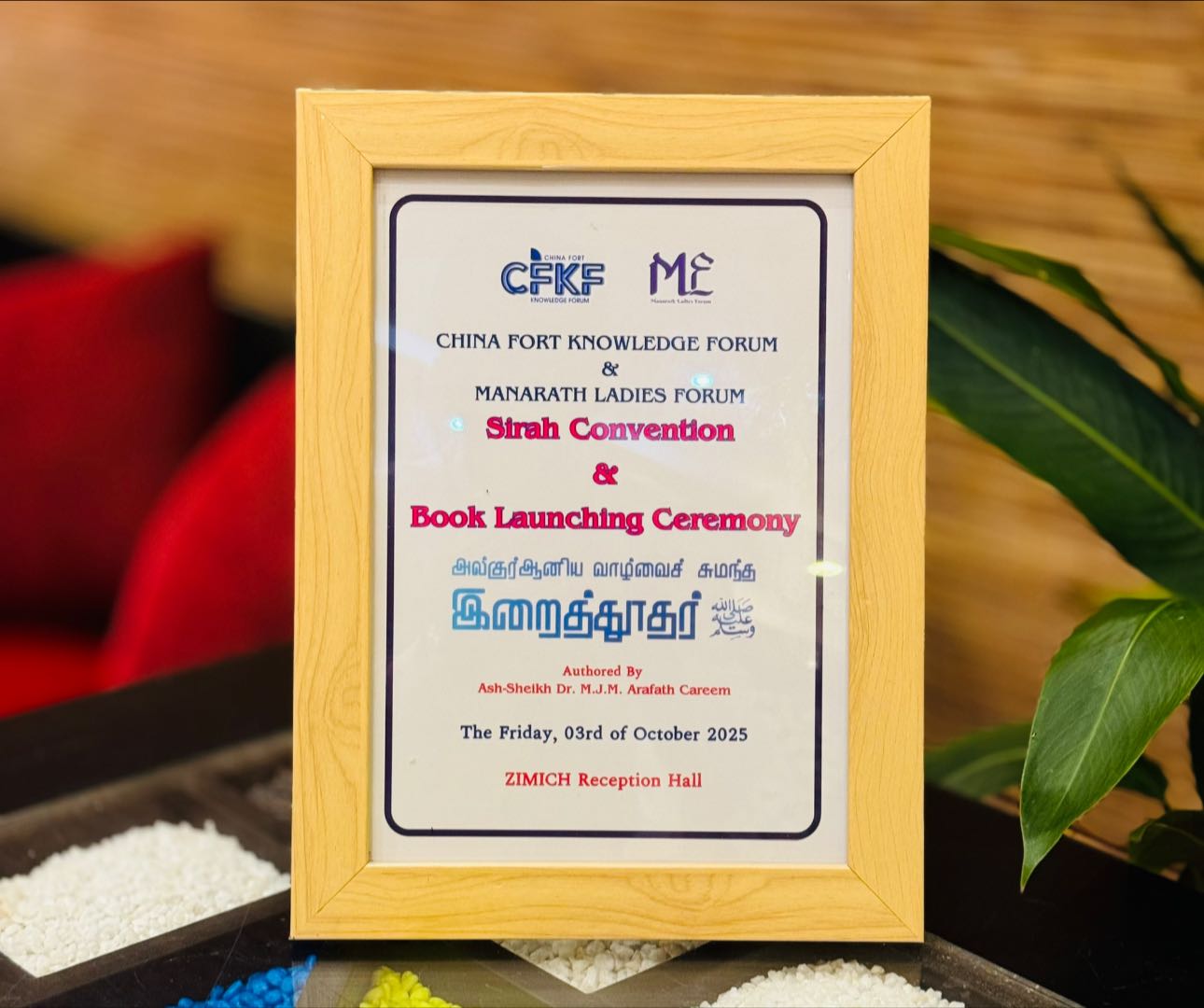 • “அல்குர்ஆனிய வாழ்வைச் சுமந்த இறைத்தூதர் (ஸல்)” என்ற நூலுக்கான ஆய்வுரையை அஷ்ஷெய்க் நவாஸ் ஸனூர்தீன் அவர்கள் தனித்துவமான கோணத்தில் வழங்கினார்.