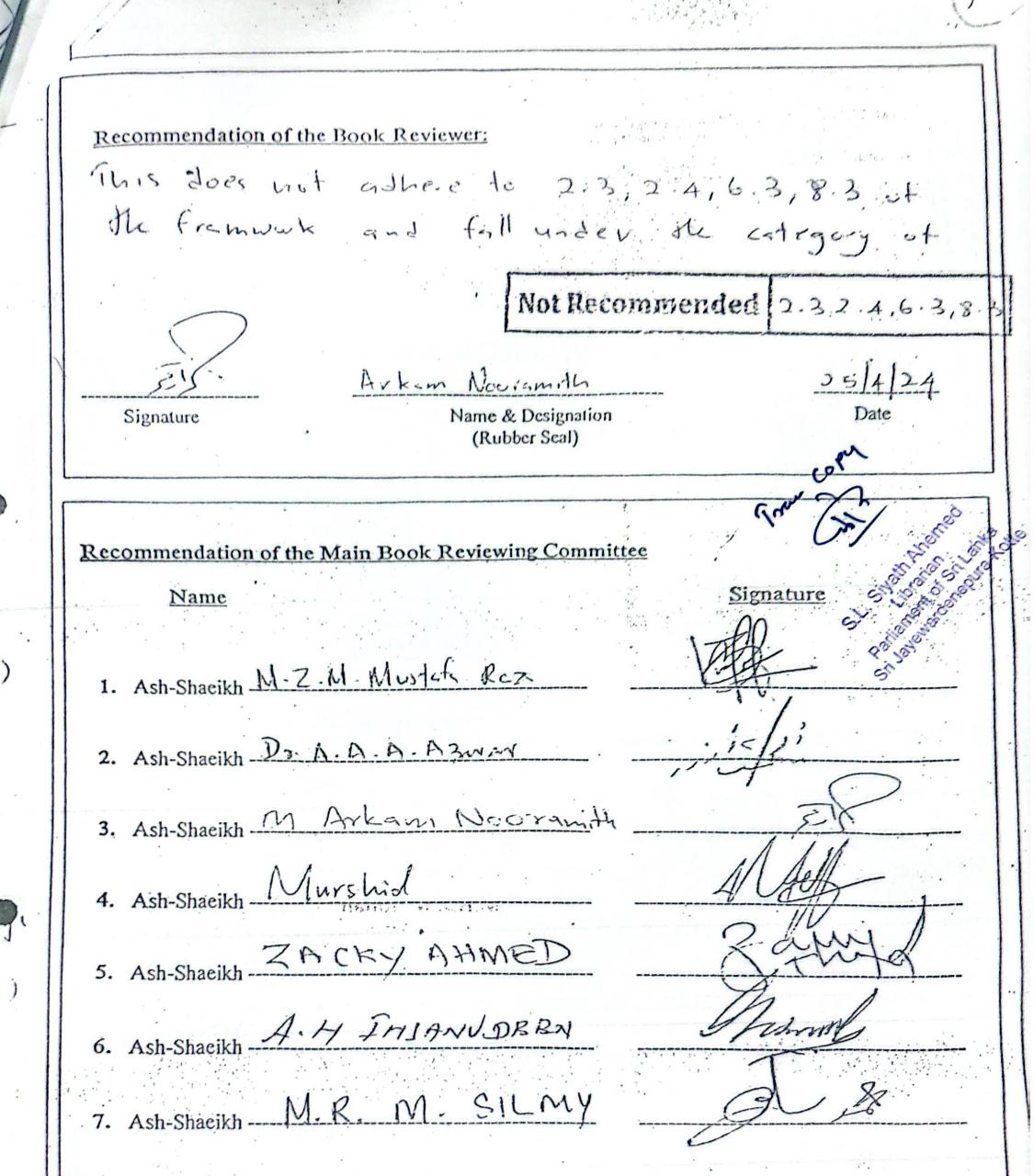 2024.04.25 இடம்பெற்ற மீள்பரிசீலனைக் குழு கூட்டத்தில் குறித்த மொழிபெயர்ப்புப் பிரதிகள் குறித்த குழுவின் நிபந்தனைகளுக்கு ஏற்புடையதாக இருக்கவில்லை என்ற காரணத்தை அடிப்படையாகக் கொண்டு அவற்றின் இறக்குமதி அனுமதி நிராகரிக்கப்பட்டதாக முஸ்லிம் சமய கலாசார திணைக்கள கூட்ட நடப்புக் குறிப்புக்கள் குறிப்பிடுகின்றன. இந்த மீள்பரிசீலனைக் கூட்டத்தில் அகில இலங்கை ஜம்மியத்துல் உலமா சபையின் சிரேஷ்ட உறுப்பினர்களான, அஷ்சேய்க் அர்க்கம் நூராமித், அஷ்சேய்க் (கலாநிதி) ஏ.ஏ.ஏ. அஸ்வர், அஷ்சேய்க் முர்ஷித் முலப்பர், அஷ்சேய்க் முஸ்தபா ரஸா ஆகிய நான்கு குழு உறுப்பினர்கள் கலந்துகொண்டு ஒப்புதல் வழங்கிதாக ஆதாரங்கள் கிடைப்பப்பெறுகின்றன.