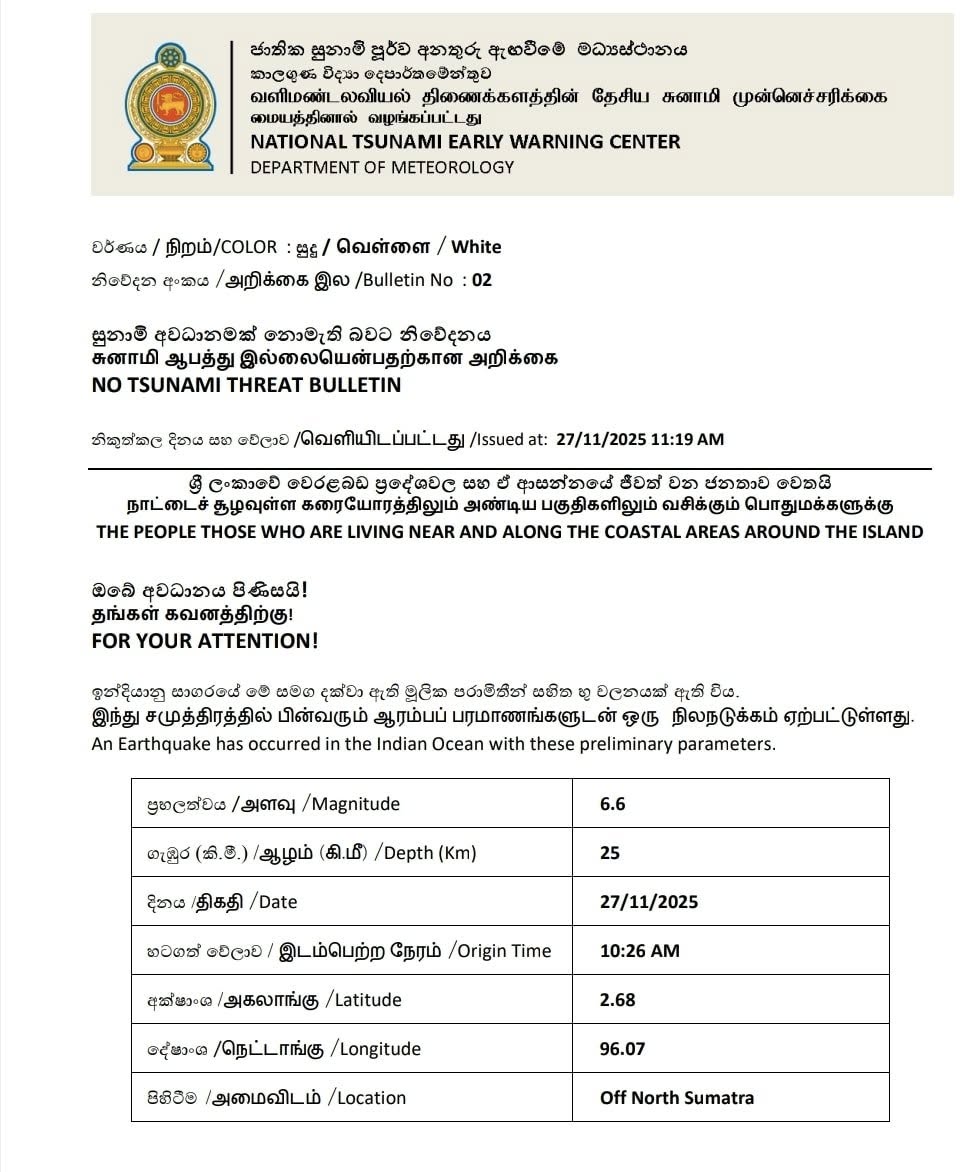 இந்து சமுத்திரத்தில் 6.6 மெக்னிடியூட் அளவில் நிலநடுக்கம் பதிவாகியுள்ளதாக வளிமண்டலவியல் திணைக்களத்தின் தேசிய சுனாமி முன்னெச்சரிக்கை நிலையம் தெரிவித்துள்ளது.
