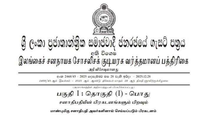 நேற்று (28) திகதியிடப்பட்ட 2468/46 ஆம் இலக்க அதிவிசேட வர்த்தமானிப் பத்திரிகை மூலம் இந்த அறிவித்தல் வெளியிடப்பட்டுள்ளமை குறிப்பிடத்தக்கது.