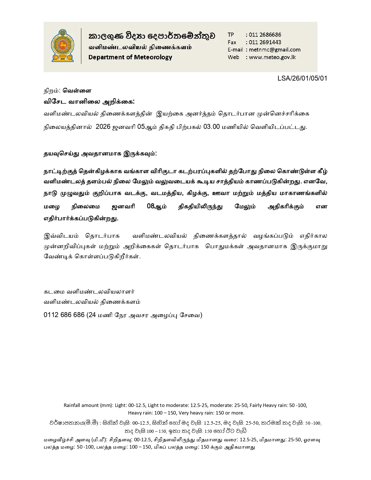 எனவே, நாடு முழுவதும் குறிப்பாக வடக்கு, வடமத்திய, கிழக்கு, ஊவா மற்றும் மத்திய மாகாணங்களில் நிலைமை ஜனவரி 08ஆம் திகதியிலிருந்து மேலும் அதிகரிக்கும் என எதிர்பார்க்கப்படுகின்றது.