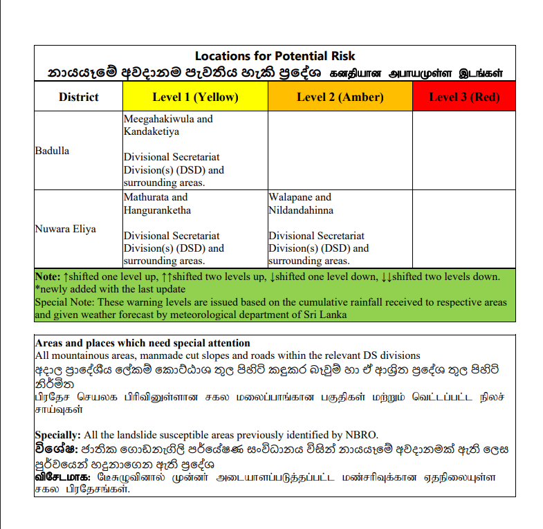 தேசிய கட்டிட ஆராய்ச்சி நிறுவனம் விடுத்துள்ள அறிவிப்பின்படி நுவரெலியா மாவட்டத்தின் வலப்பனை, நில்தண்டஹின்ன, மதுரட்ட, ஹங்குரன்கெத்த ஆகிய பகுதிகளுக்கும் பதுளை மாவட்டத்தின் மீகஹகிவுல, கந்தகட்டிய ஆகிய பகுதிகளுக்கும் இந்த எச்சரிக்கை விடுக்கப்பட்டுள்ளது.